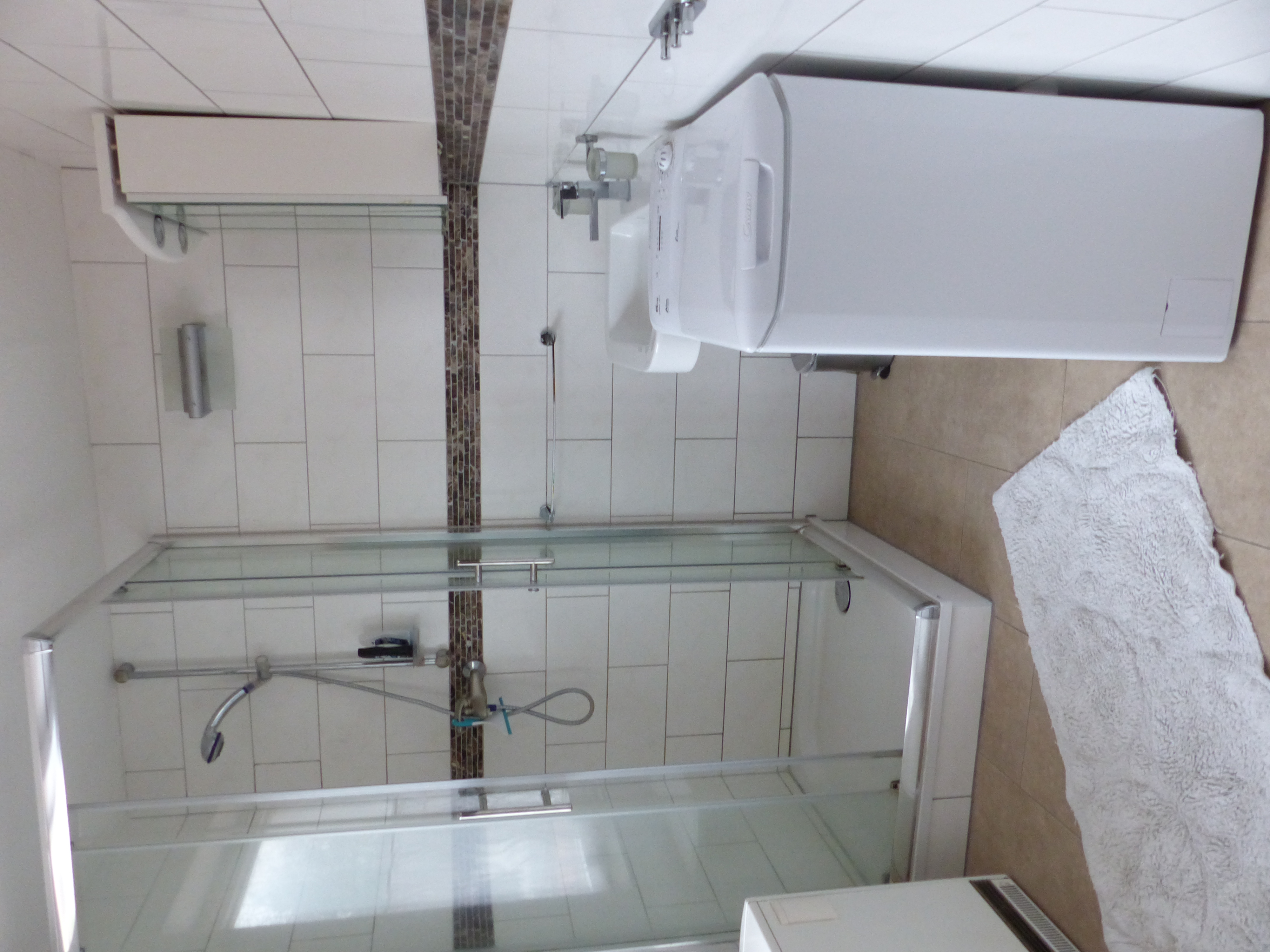 Badezimmer mit Dusche, WC und Waschmaschine in der Wohnung.