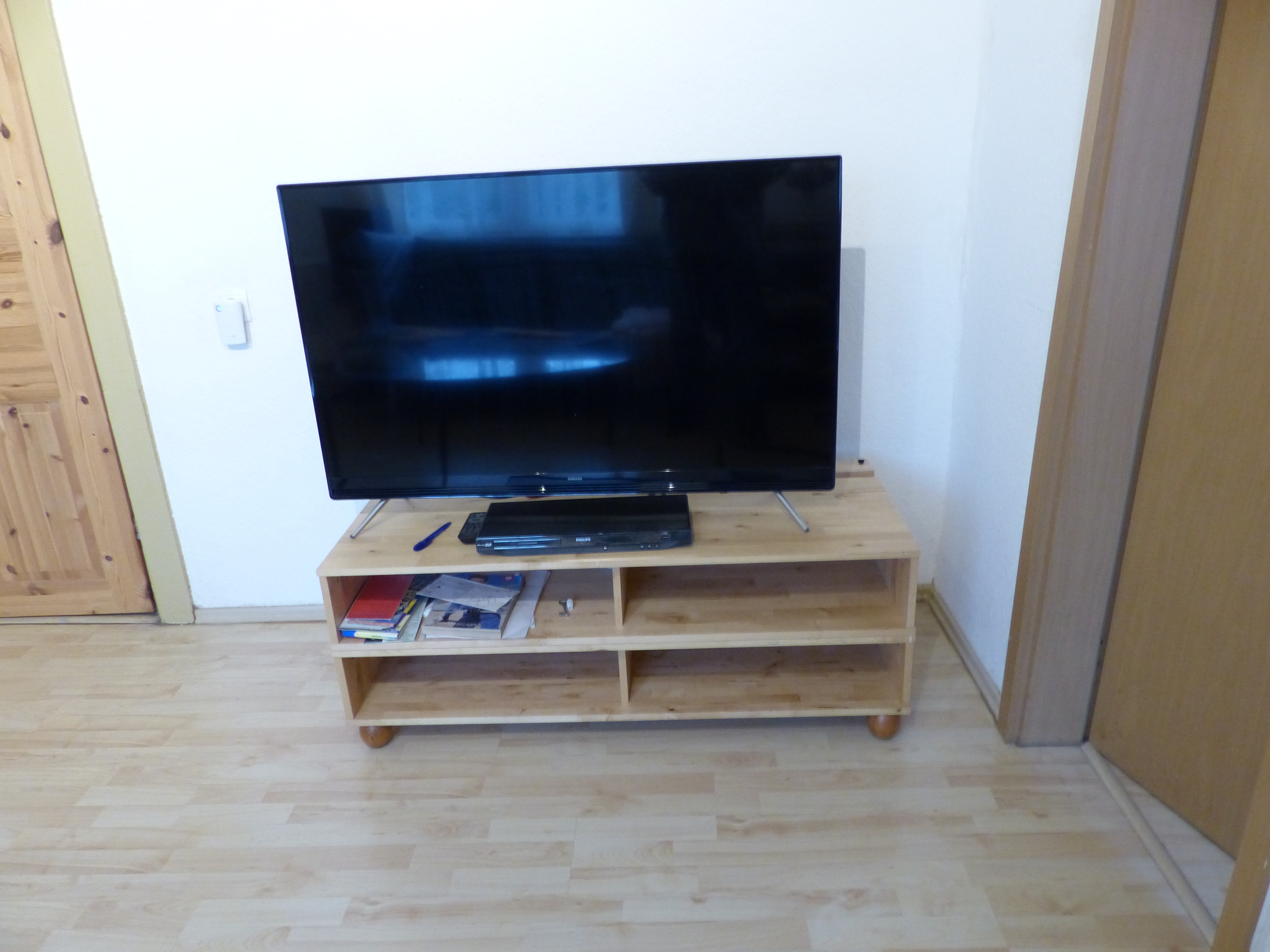 Das Wohnzimmer ist eingerichtet mit einer Couch, zwei Schwingstühlen, einem Verstärker mit Tuner, einem Fernseher mit DVD und einer Essgruppe für 4 Personen.
